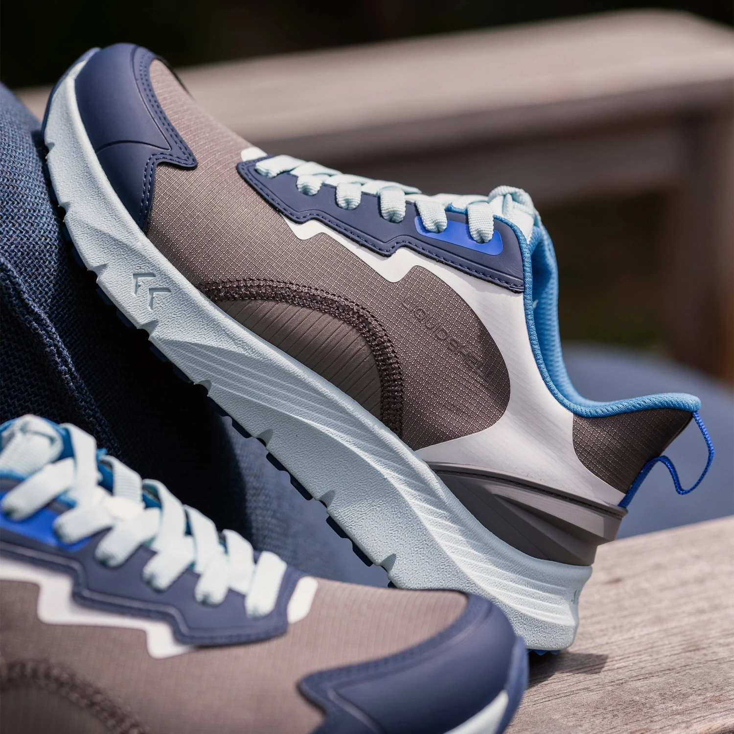 Fashion and function merge in this tech-driven athletic style featuring an adjustable lacing system, breathable mesh upper, and protective mudguard. Inside, there’s a removable contoured footbed made of memory foam and cork for comfort, while an ultra-lightweight EVA ReBounce™ outsole with rubber tread delivers optimum performance.