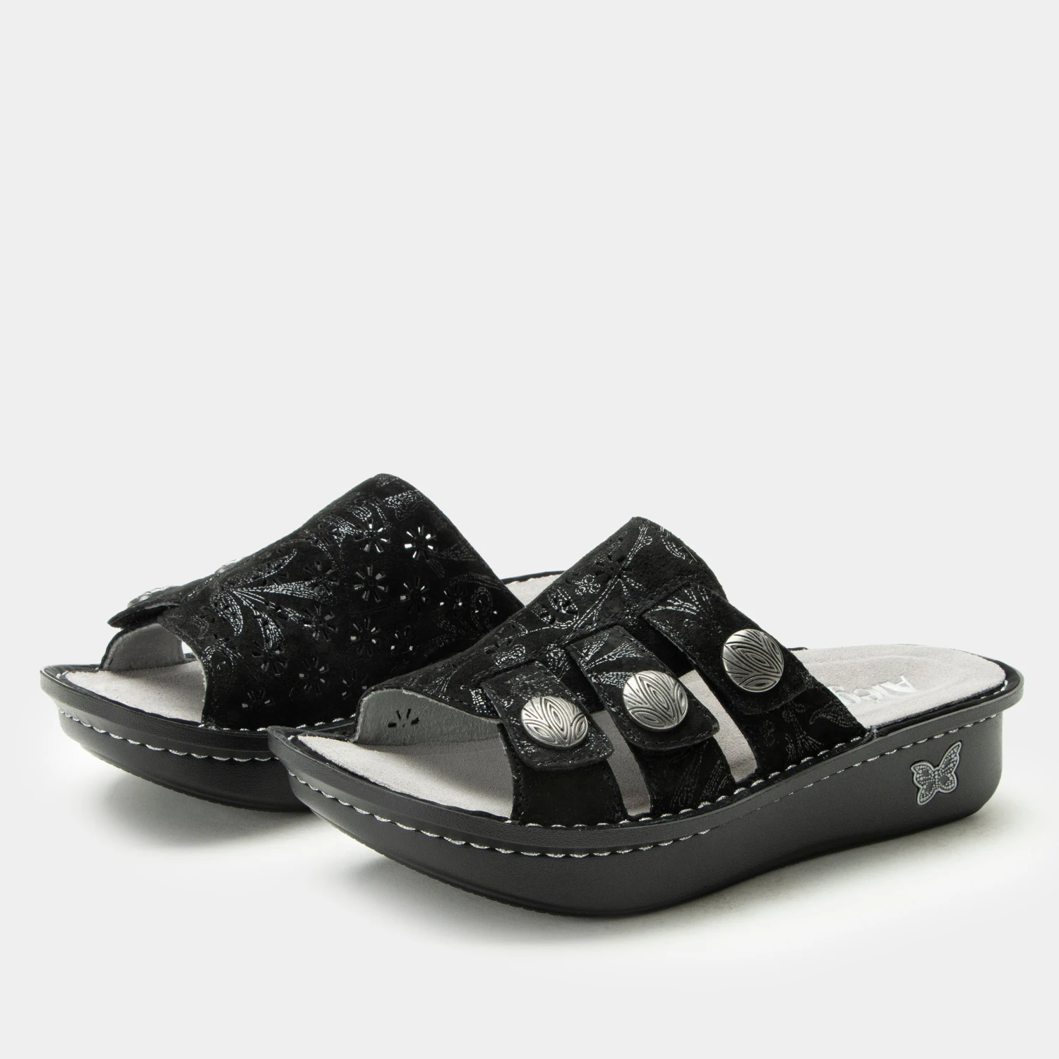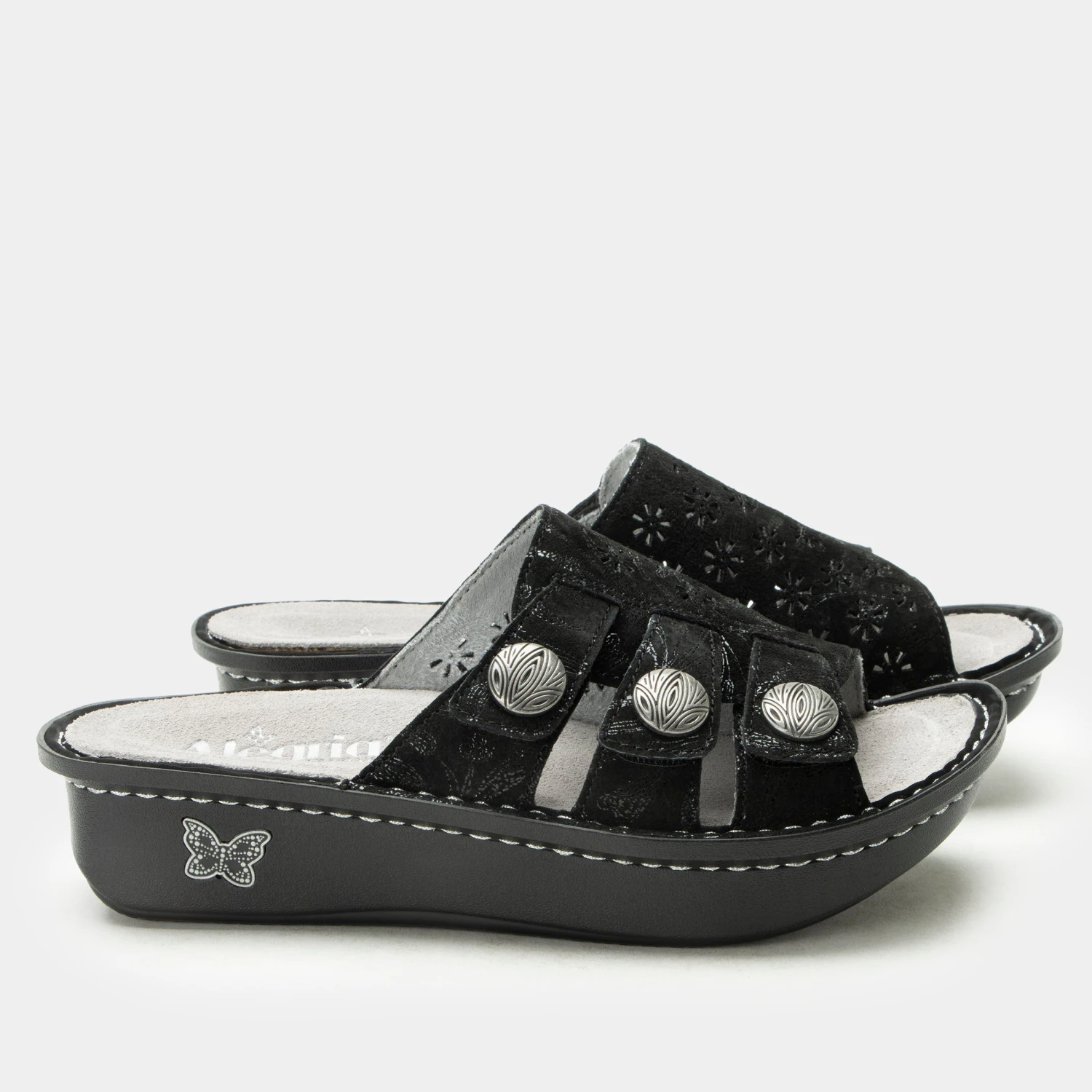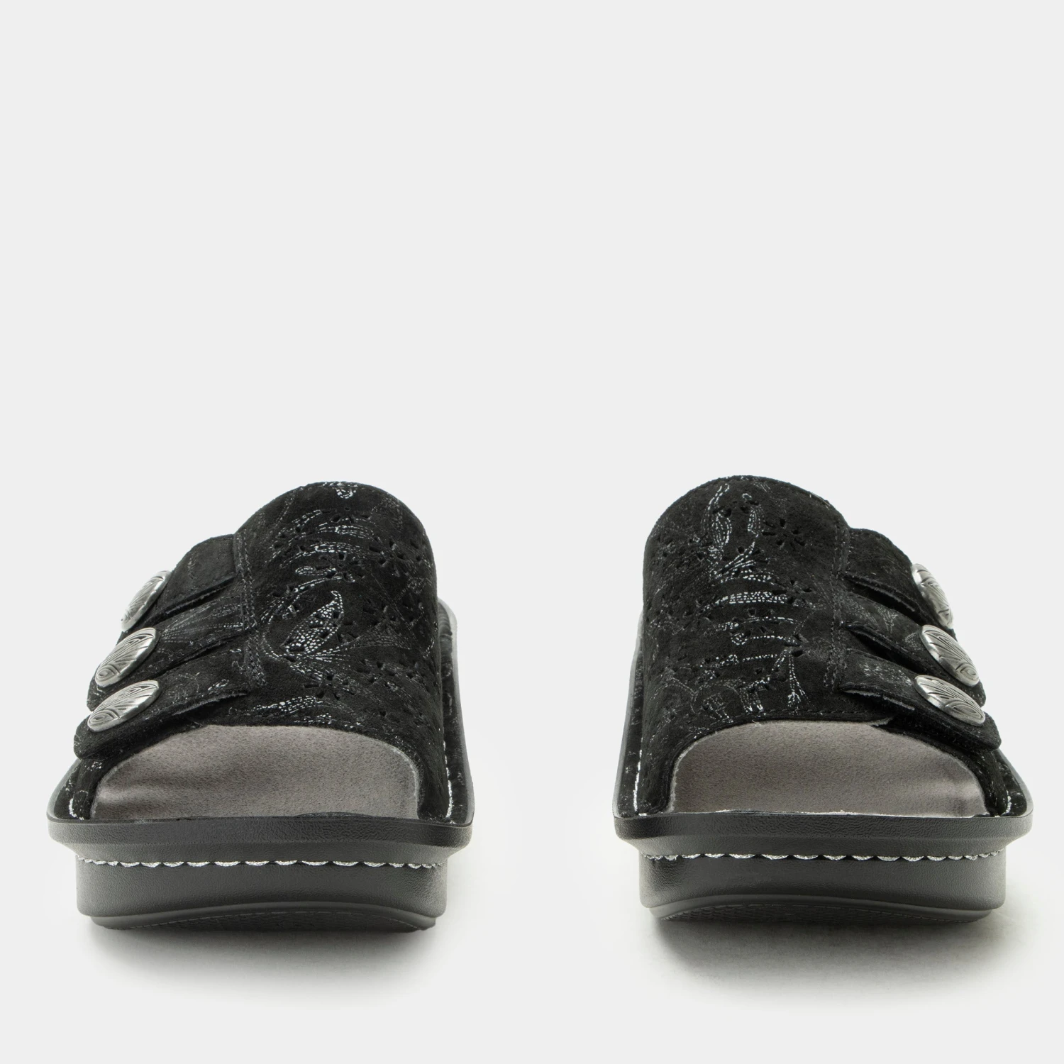 The Julee slide on sandal has a adjustable hook-and-loop closures with a decorative buckle and laser cut details. Sitting on a classic rocker outsole.