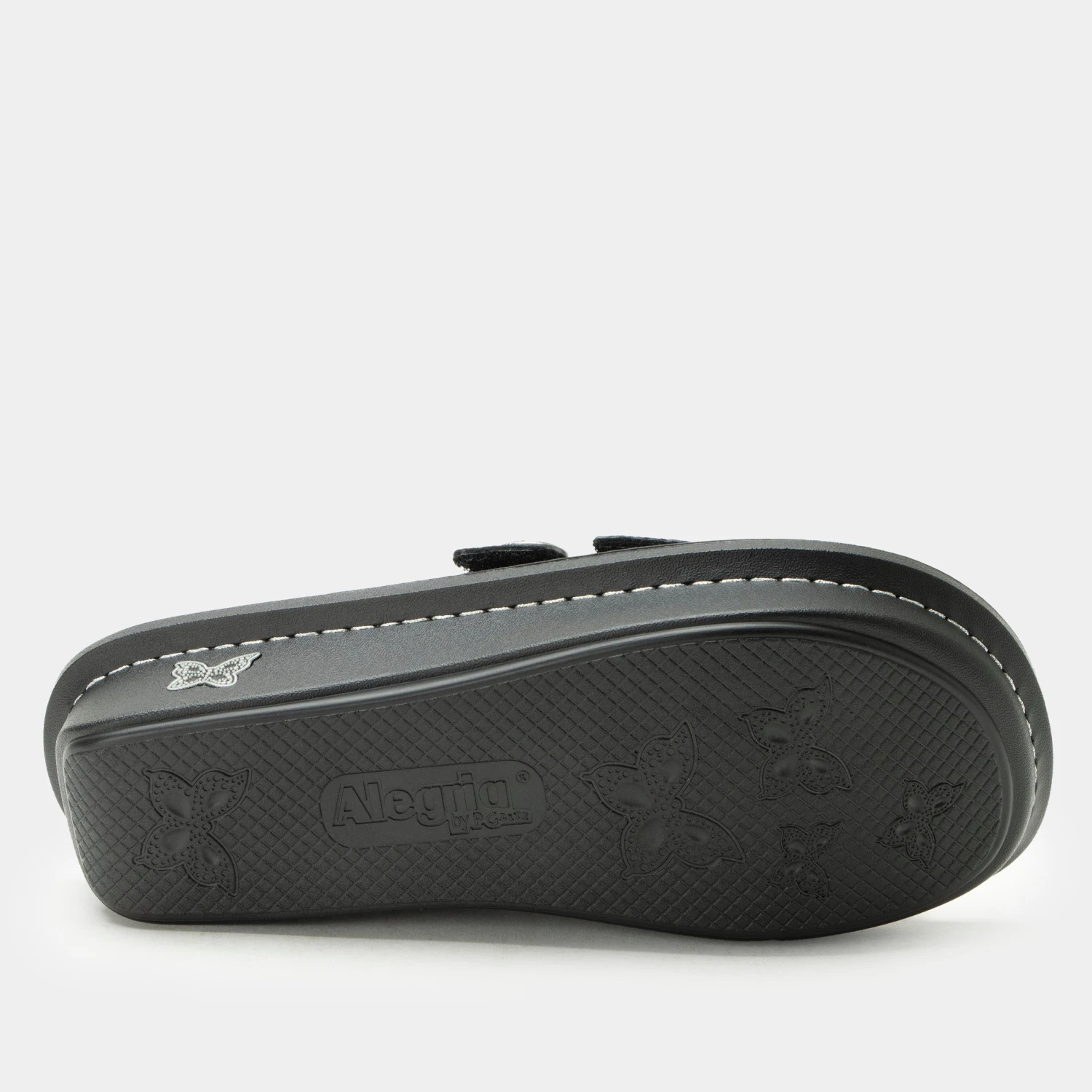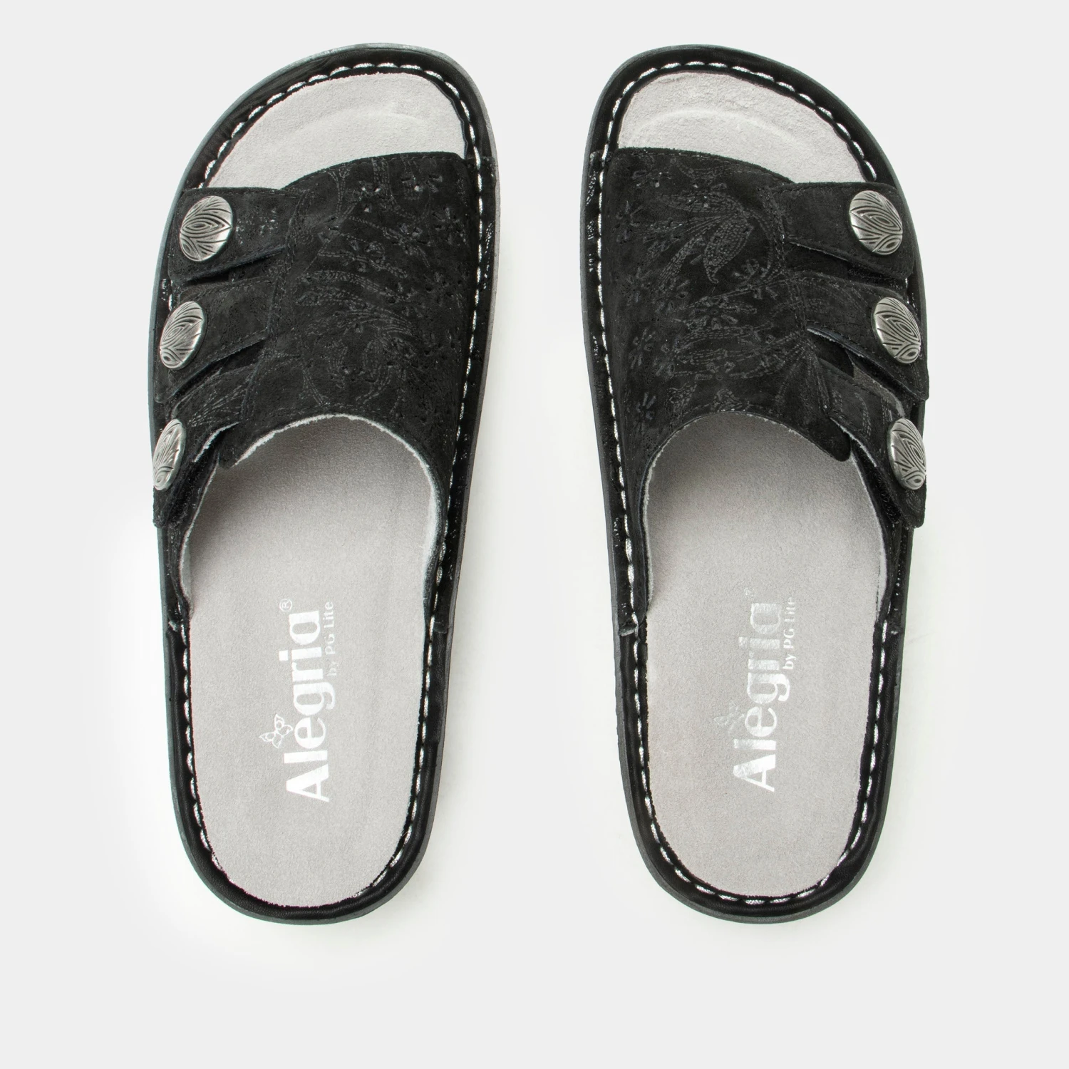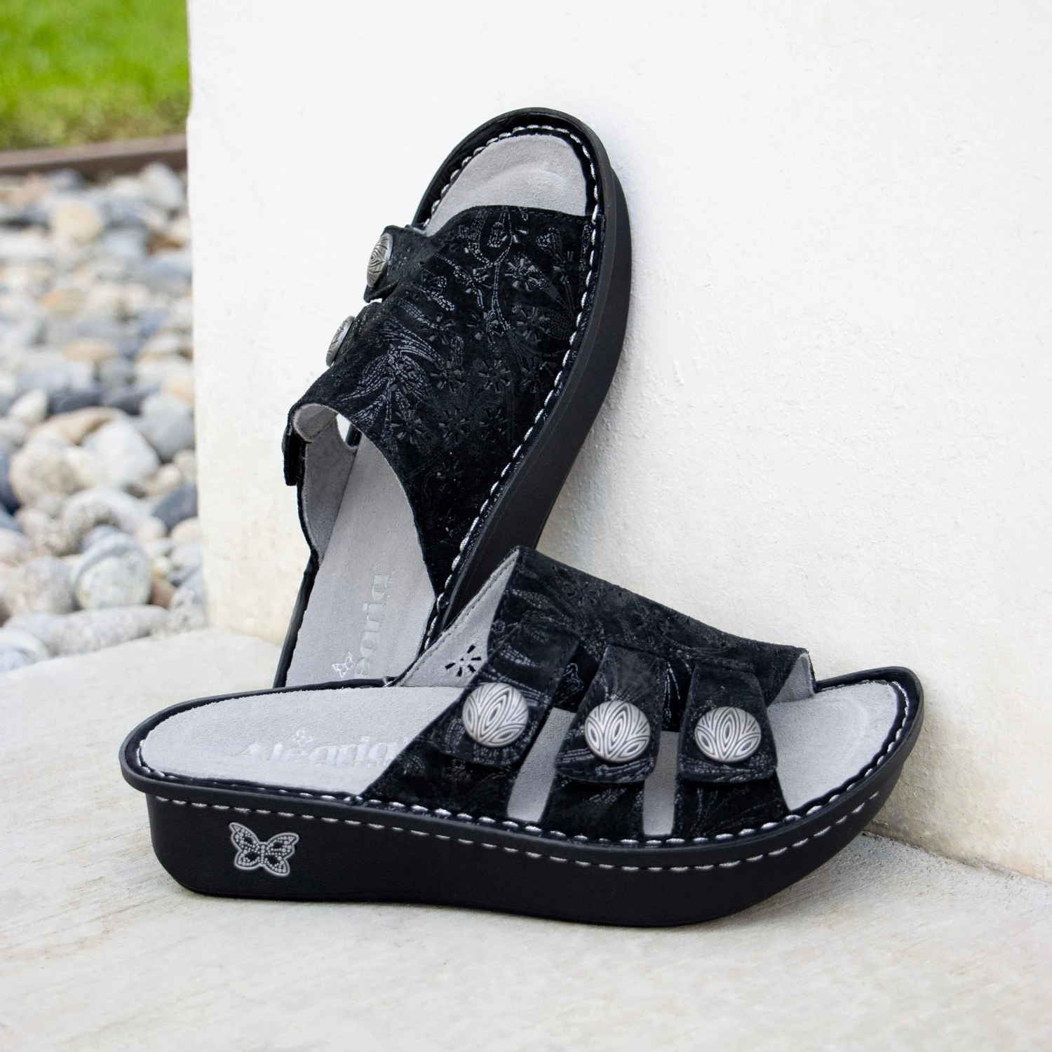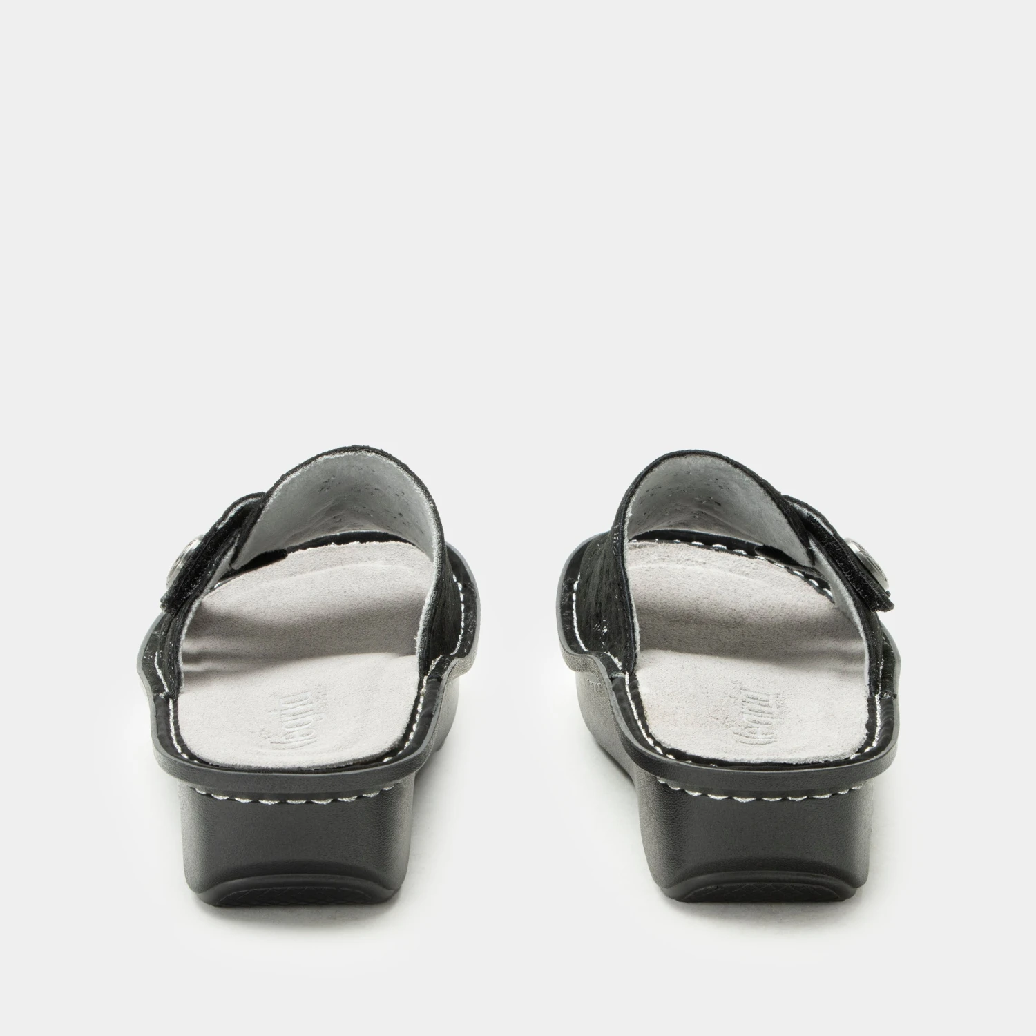 The Julee slide on sandal has a adjustable hook-and-loop closures with a decorative buckle and laser cut details. Sitting on a classic rocker outsole.