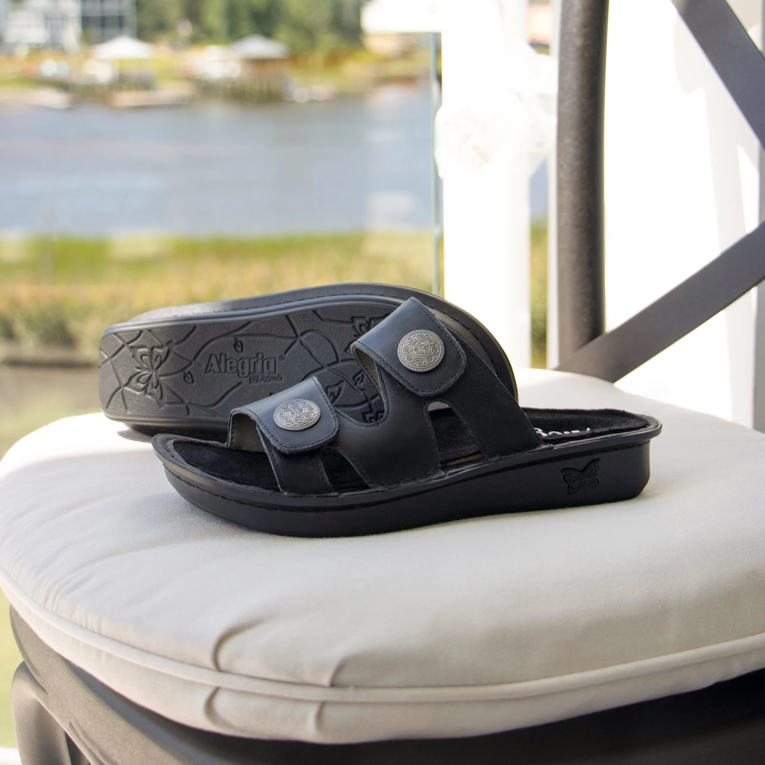 Decorative ornaments with a handmade touch elevate a pair of bold adjustable hook-and-loop straps on this versatile leather slide. Keeping feet well cushioned and supported in a removable memory foam and cork footbed coupled with a mini outsole.